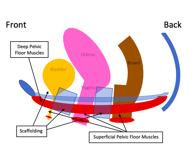 Scaffolding: (I come from a long line of tradies, it’s my only excuse for using this word) AKA ligaments + fascia, is what forms the structure or the “shape” of the insides of the pelvis. Scaffolding helps to keep organs up and exit shoots (urethra, vagina and rectum) running in their own lanes…winner! If the scaffolding stretches and softens a bit, we call this prolapse. Prolapse comes in stages, with a little bit of stretching being Stage 1 and a lot a stretching being Stage 4.