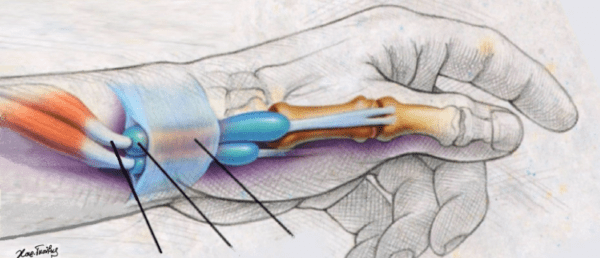 There are two tendons at the back of your thumb called the APL and EPB (with the unreasonably long names of Adductor Pollicis Longus and Extensor Pollicis Brevis) . These tendons travel through a little tunnel in the back of thumb and connect to the muscles in the forearm. When these two tendons are working harder than normal, they start to rub on the inside of the tunnel, which can make them angry and inflamed. When this continues, the tendons can even grow in response, which makes the tunnel even more constricted.