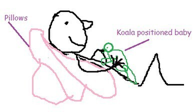 Lie down on the job to breast-feed. Try propping yourself up with pillows behind your back. Feel free to have munchkin placed across your body (traditional feeding) or laying vertically on your stomach (this is called koala feeding, cute name huh!).